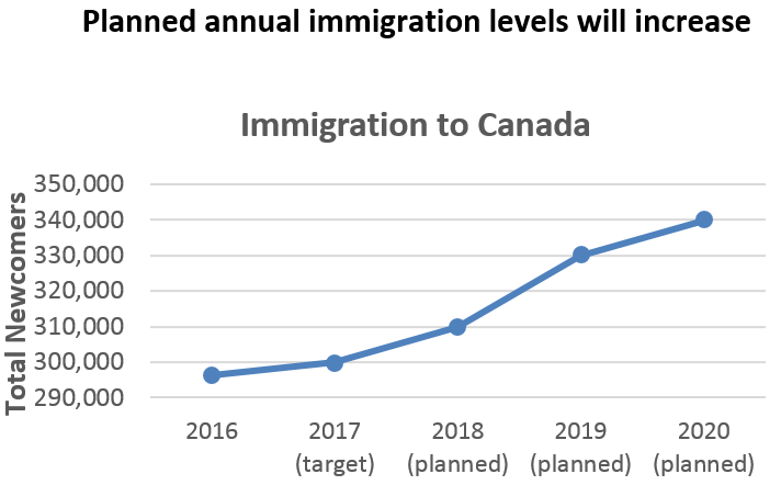 Bajo el plan plurianual de niveles de inmigración del gobierno federal presentado a fines de octubre, el objetivo de Canadá de ingresos totales en el país a través de sus diversos programas económicos, familiares y de refugiados aumentará en más de un 13% entre 2018 y 2021, de 310,000 a 350,000.